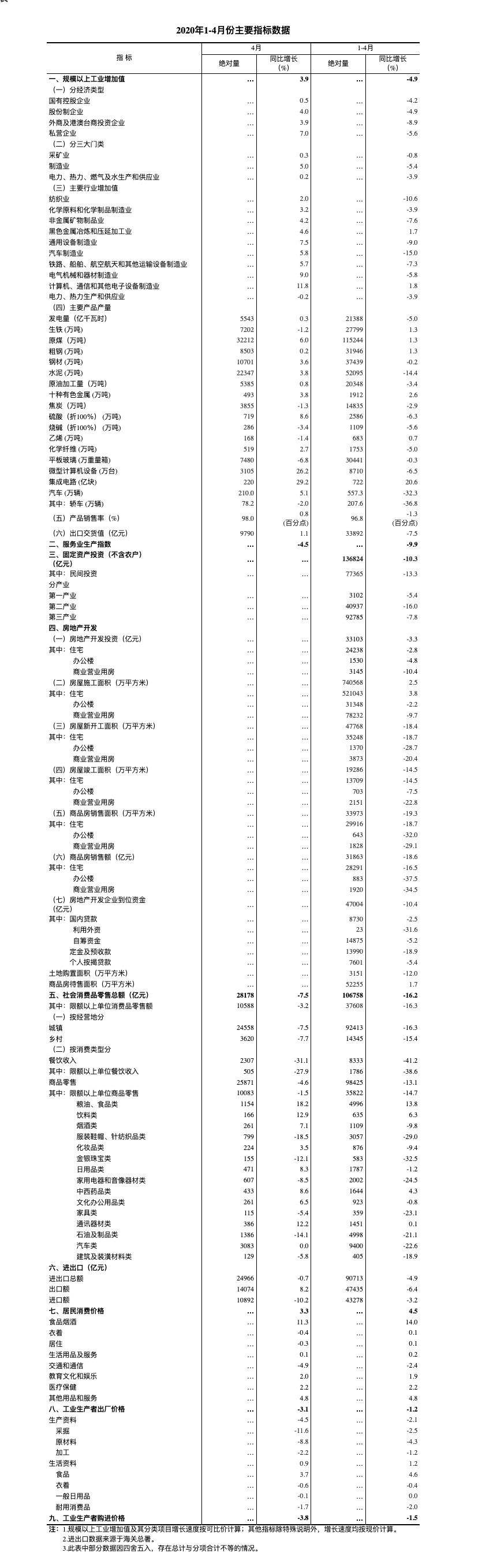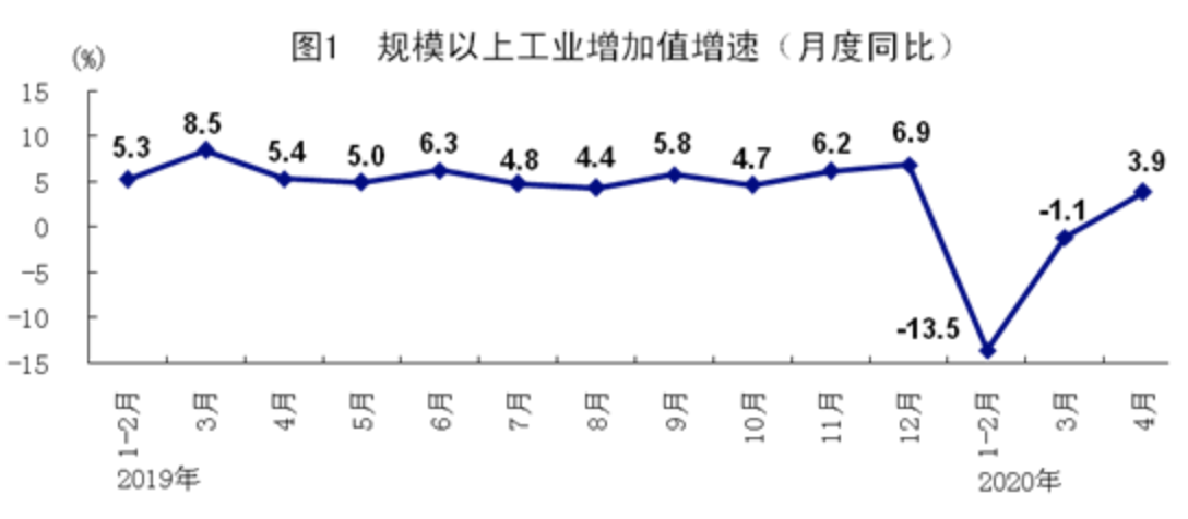 4月份,全國(guó)規(guī)模以上工業(yè)增加值同比增長(zhǎng)3.9%,3月份為下降1.1%;環(huán)比增長(zhǎng)2.27%。1-4月份,全國(guó)規(guī)模以上工業(yè)增加值同比下降4.9%,降幅比1-3月份收窄3.5個(gè)百分點(diǎn)。4月份,分經(jīng)濟(jì)類(lèi)型看,國(guó)有控股企業(yè)增加值增長(zhǎng)0.5%;股份制企業(yè)增長(zhǎng)4.0%,外商及港澳臺(tái)商投資企業(yè)增長(zhǎng)3.9%;私營(yíng)企業(yè)增長(zhǎng)7.0%。分三大門(mén)類(lèi)看,采礦業(yè)增加值增長(zhǎng)0.3%;制造業(yè)增長(zhǎng)5.0%,3月份為下降1.8%;電力、熱力、燃?xì)饧八a(chǎn)和供應(yīng)業(yè)增長(zhǎng)0.2%。高技術(shù)制造業(yè)和裝備制造業(yè)增長(zhǎng)較快。4月份,高技術(shù)制造業(yè)和裝備制造業(yè)增加值分別增長(zhǎng)10.5%和9.3%,快于規(guī)模以上工業(yè)6.6和5.4個(gè)百分點(diǎn)。從產(chǎn)品產(chǎn)量看,光纜,挖掘、鏟土運(yùn)輸機(jī)械,集成電路,工業(yè)機(jī)器人,微型計(jì)算機(jī)設(shè)備產(chǎn)量同比分別增長(zhǎng)43.8%、40.8%、29.2%、26.6%、26.2%。