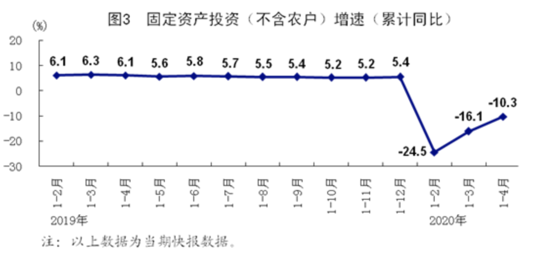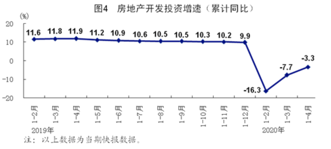 1-4月份,全國(guó)固定資產(chǎn)投資(不含農(nóng)戶(hù))136824億元,同比下降10.3%,降幅比1-3月份收窄5.8個(gè)百分點(diǎn);4月份環(huán)比增長(zhǎng)6.19%。分領(lǐng)域看,基礎(chǔ)設(shè)施投資同比下降11.8%,制造業(yè)投資下降18.8%,房地產(chǎn)開(kāi)發(fā)投資下降3.3%,降幅分別比1-3月份收窄7.9、6.4、4.4個(gè)百分點(diǎn)。全國(guó)商品房銷(xiāo)售面積33973萬(wàn)平方米,下降19.3%;商品房銷(xiāo)售額31863億元,下降18.6%,降幅分別比1-3月份收窄7.0和6.1個(gè)百分點(diǎn)。分產(chǎn)業(yè)看,第一產(chǎn)業(yè)投資下降5.4%,第二產(chǎn)業(yè)投資下降16.0%,第三產(chǎn)業(yè)投資下降7.8%,降幅分別比1-3月份收窄8.4、5.9、5.7個(gè)百分點(diǎn)。高技術(shù)產(chǎn)業(yè)投資下降3.0%,降幅小于全部投資7.3個(gè)百分點(diǎn),比1-3月份收窄9.1個(gè)百分點(diǎn);其中,高技術(shù)制造業(yè)和高技術(shù)服務(wù)業(yè)投資分別下降3.6%和1.7%。高技術(shù)制造業(yè)中,計(jì)算機(jī)及辦公設(shè)備制造投資增長(zhǎng)15.4%。高技術(shù)服務(wù)業(yè)中,科技成果轉(zhuǎn)化服務(wù)、電子商務(wù)服務(wù)、專(zhuān)業(yè)技術(shù)服務(wù)投資分別增長(zhǎng)28.0%、25.6%、12.5%。社會(huì)領(lǐng)域投資下降3.1%,比1-3月份收窄5.7個(gè)百分點(diǎn);其中,衛(wèi)生、教育領(lǐng)域投資同比增速由負(fù)轉(zhuǎn)正,分別增長(zhǎng)4.7%、2.9%。