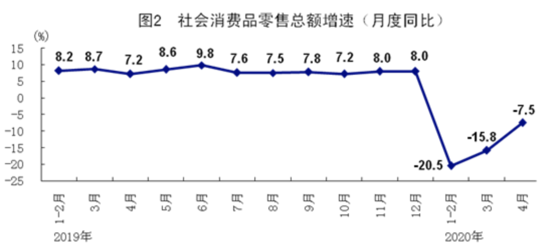 4月份,社會(huì)消費(fèi)品零售總額28178億元,同比下降7.5%,降幅比3月份收窄8.3個(gè)百分點(diǎn);環(huán)比增長(zhǎng)0.32%。1-4月份,社會(huì)消費(fèi)品零售總額106758億元,同比下降16.2%,降幅比1-3月份收窄2.8個(gè)百分點(diǎn)。4月份,按經(jīng)營(yíng)單位所在地分,城鎮(zhèn)消費(fèi)品零售額24558億元,同比下降7.5%;鄉(xiāng)村消費(fèi)品零售額3620億元,下降7.7%。按消費(fèi)類(lèi)型分,餐飲收入2307億元,下降31.1%;商品零售25871億元,下降4.6%。基本生活類(lèi)商品較快增長(zhǎng),4月份,限額以上單位商品零售額中,糧油食品類(lèi)和飲料類(lèi)同比分別增長(zhǎng)18.2%和12.9%。消費(fèi)升級(jí)類(lèi)商品銷(xiāo)售改善,4月份,通訊器材類(lèi)和文化辦公用品類(lèi)分別增長(zhǎng)12.2%和6.5%,比3月份分別加快5.7和0.4個(gè)百分點(diǎn)。網(wǎng)上零售較為活躍,1-4月份,全國(guó)網(wǎng)上零售額30698億元,同比增長(zhǎng)1.7%,1-3月份為下降0.8%;其中,實(shí)物商品網(wǎng)上零售額增長(zhǎng)8.6%,比1-3月份加快2.7個(gè)百分點(diǎn),占社會(huì)消費(fèi)品零售總額的比重為24.1%,比1-3月份提高0.5個(gè)百分點(diǎn)。
