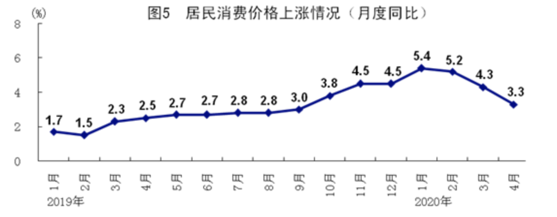 4月份,全國(guó)居民消費(fèi)價(jià)格同比上漲3.3%,漲幅比3月份回落1.0個(gè)百分點(diǎn);環(huán)比下降0.9%。1-4月份,全國(guó)居民消費(fèi)價(jià)格同比上漲4.5%。分類(lèi)別看,4月份,食品煙酒價(jià)格同比上漲11.3%,衣著下降0.4%,居住下降0.3%,生活用品及服務(wù)上漲0.1%,交通和通信下降4.9%,教育文化和娛樂(lè)上漲2.0%,醫(yī)療保健上漲2.2%,其他用品和服務(wù)上漲4.8%。在食品煙酒價(jià)格中,糧食上漲1.2%,鮮菜下降3.7%,豬肉上漲96.9%,鮮果下降10.5%。扣除食品和能源價(jià)格后的核心CPI上漲1.1%,漲幅比3月份回落0.1個(gè)百分點(diǎn)。